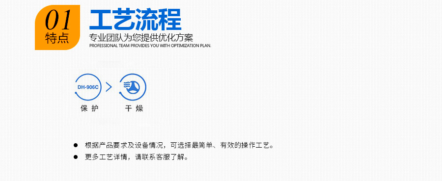 DunHua906C 使用建議 操作方式 浸沒 使用濃度 100% Vol 處理溫度 常溫 處理時間 10s~180s 適用范圍 適用于黑色金屬及電鍍后金屬的封閉緩蝕