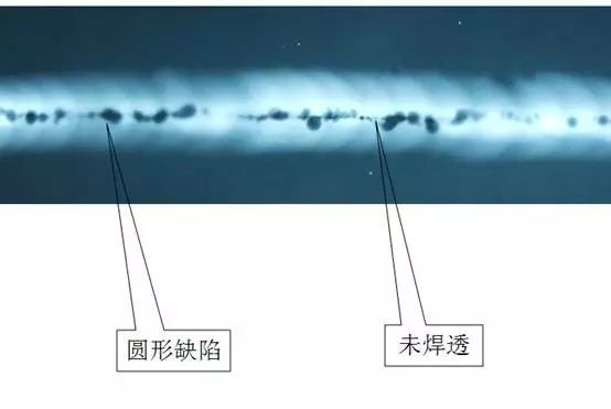 上圖所示,從圖中可以很清楚的看到焊縫中心有許多圓形缺陷(圓形氣孔),再仔細(xì)的可以看到有一條位于焊縫中心的黑直線將圓形缺陷串聯(lián)起來(lái),黑直線即為未焊透影像。