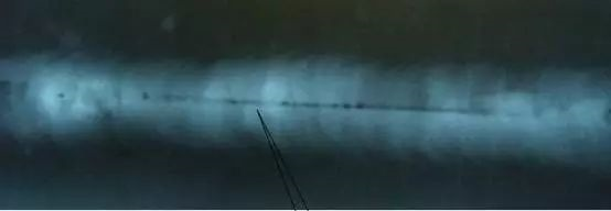 上圖所示,未焊透缺陷在底片中呈一條很直的黑線,并且處于焊縫中心,可以肯定的判定為未焊透性質(zhì)的缺陷。