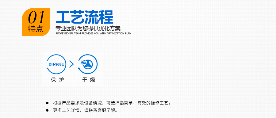 DunHua968E 使用建議 操作方式 浸沒、噴淋、涂抹 使用濃度 100% Vol 處理溫度 常溫 處理時(shí)間 10s~3min 適用范圍 銅、鋁、不銹鋼、粉末冶金、鑄鐵、電鍍系列等金屬的封閉抗氧化保護(hù)