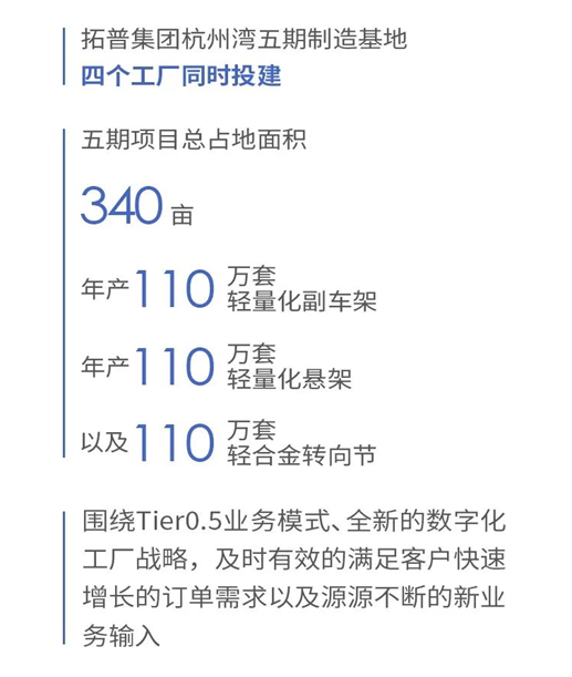拓普集團(tuán)杭州灣五期制造基地正式投建,總占地面積340畝,包含懸架系統(tǒng)六部、底盤系統(tǒng)九部、轉(zhuǎn)向節(jié)系統(tǒng)三部、輕合金系統(tǒng)十部共四大工廠。2022年中旬起陸續(xù)投產(chǎn)后可實(shí)現(xiàn)年產(chǎn)110萬套輕量化副車架,110萬套輕量化懸架以及110萬套輕合金轉(zhuǎn)向節(jié)。